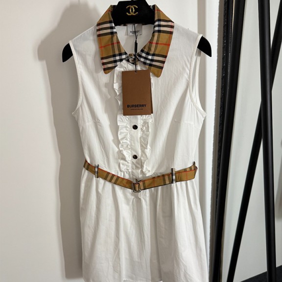 버버리 러플 플레드 라펠 스티칭 코튼 슬리브리스 베스트 드레스