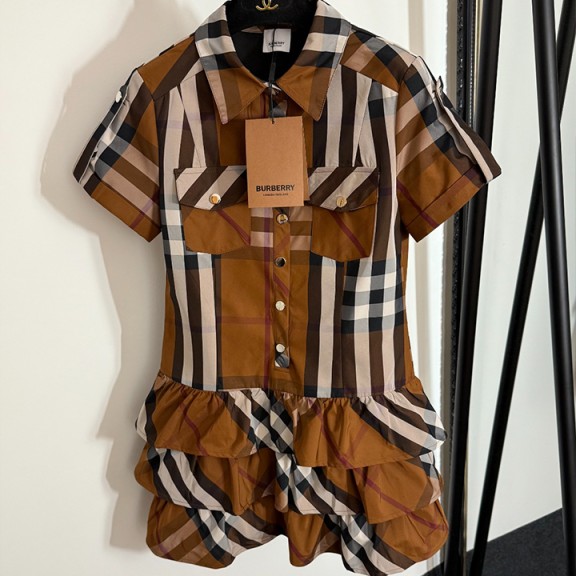 버버리 신상 불규칙한 체크무늬 연꽃잎 밑단 셔츠 칼라 반팔 코튼 원피스 수량